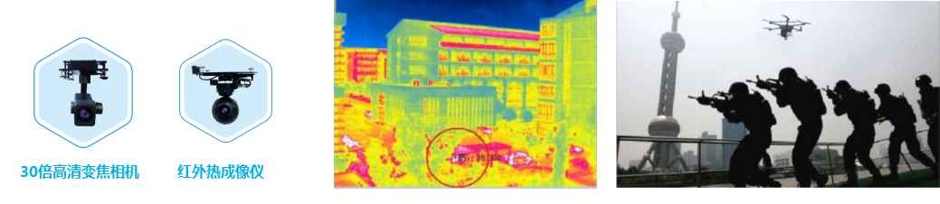 無人機可搭載30倍變焦相機飛抵現場偵察, 并將現場大致情況及時反饋給指揮中心;無人機可實施低空拍攝,將犯罪分子人數、規模、人員傷亡等情況及時傳回指揮中心,指揮中心根據無人機傳回來的消息,迅速做出決策,對武警特警、救護人員、消防人員等進行合理部署;